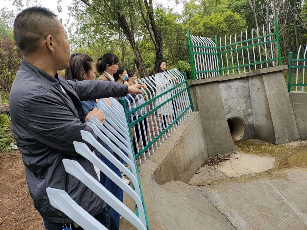 (图为审计组在工程位于湿地公园内的排水口进行实地查看)